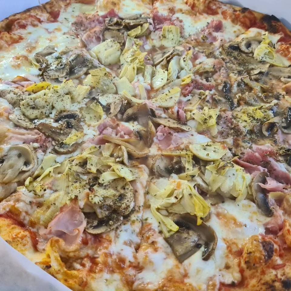 Pomodoro, Mozzarella, Prosciutto, Funghi. Carciofi, Olio, Origano