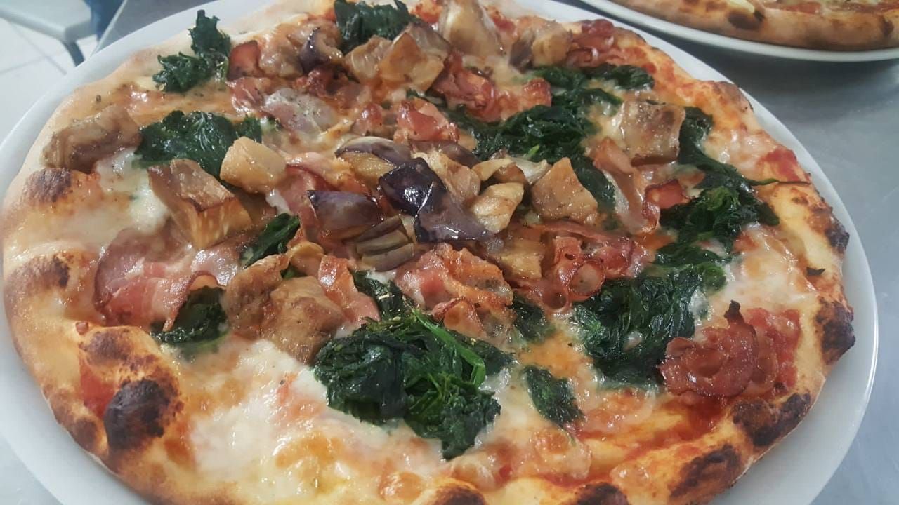 Pomodoro, Mozzarella, Funghi, Cipolla, Spinaci, Salsiccia, Olio e Origano