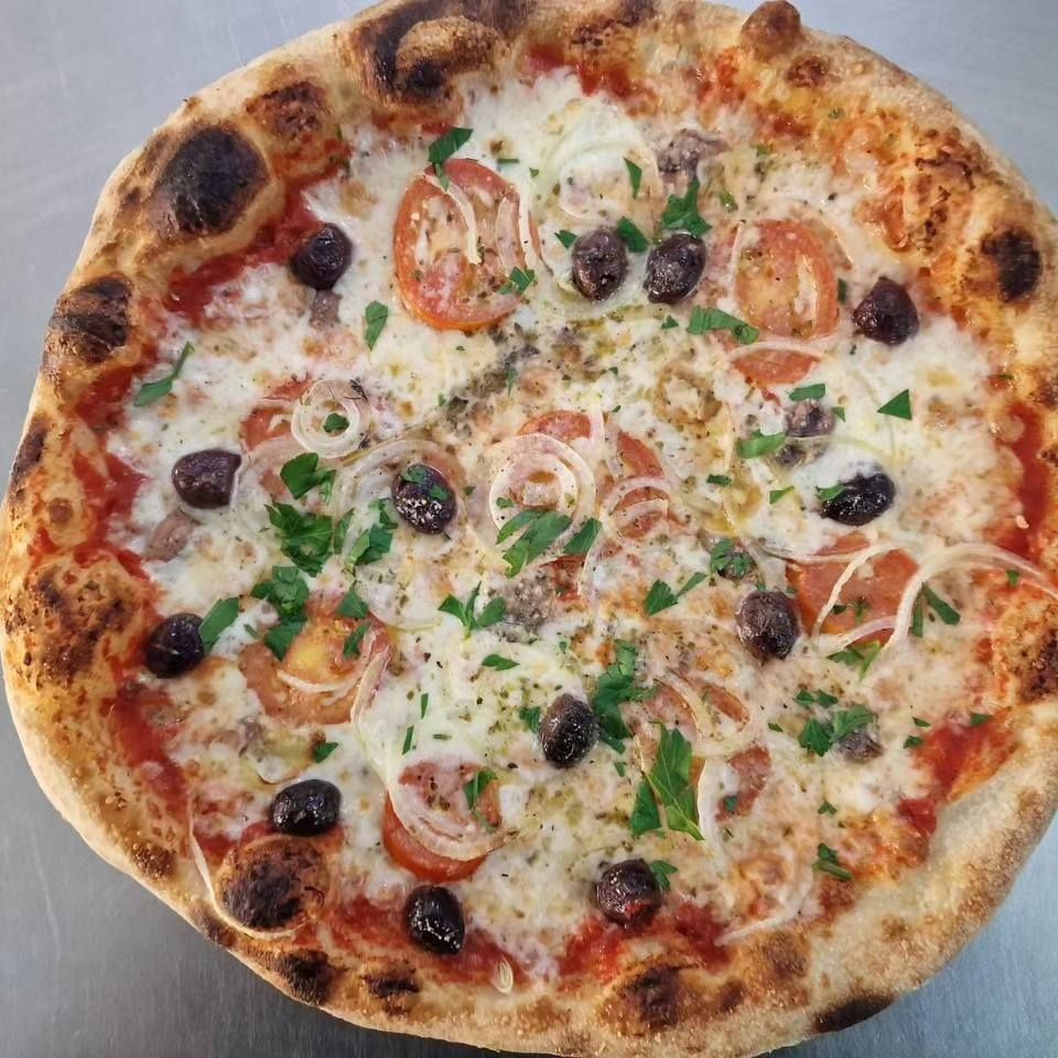 Pomodoro, Mozzarella, Salame Piccante, Olive, Acciughe, Peperoni, Olio, Origano