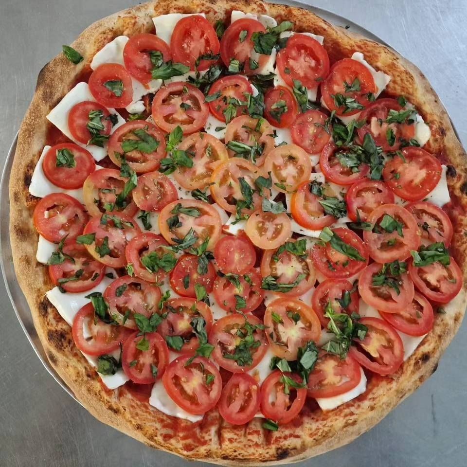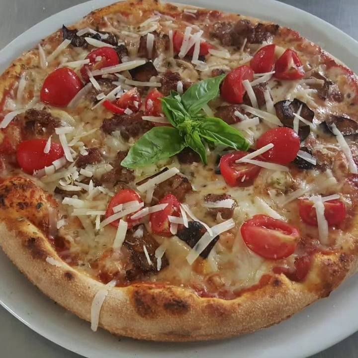 Pomodoro, mozzarella, bacon, salsiccia, melanzane, pachino, scaglie di grana e basilico